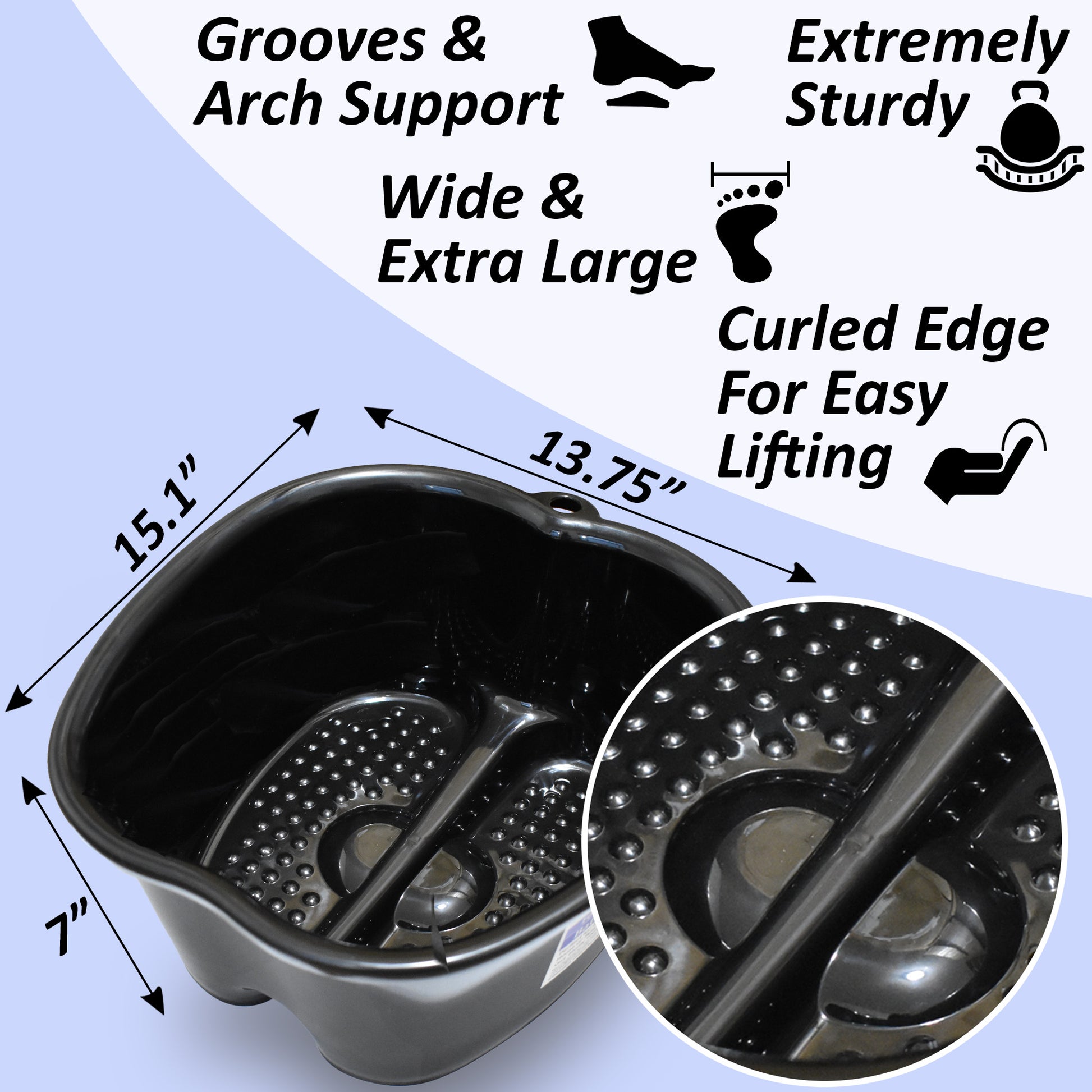 - EXTRA LARGE & STRONG BASIN: Made with industrial grade material for superior strength. The extra wide & sturdy base ensures no spills from wobbling during use. Easily washable with raised dots and rounded arch supports on bottom for maximum massage therapy while soaking. It has durable rounded edges to effortlessly pick up and move your foot bath where you’d like to soak your feet.